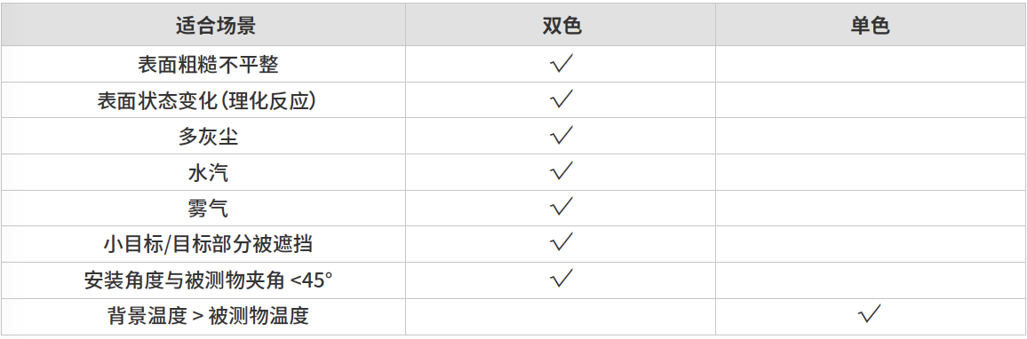 水汽等影響因素不敏感,在復(fù)雜苛刻的工業(yè)場(chǎng)景下依然可以獲得較高的測(cè)溫準(zhǔn)確度。不同場(chǎng)景的選型推薦如下: