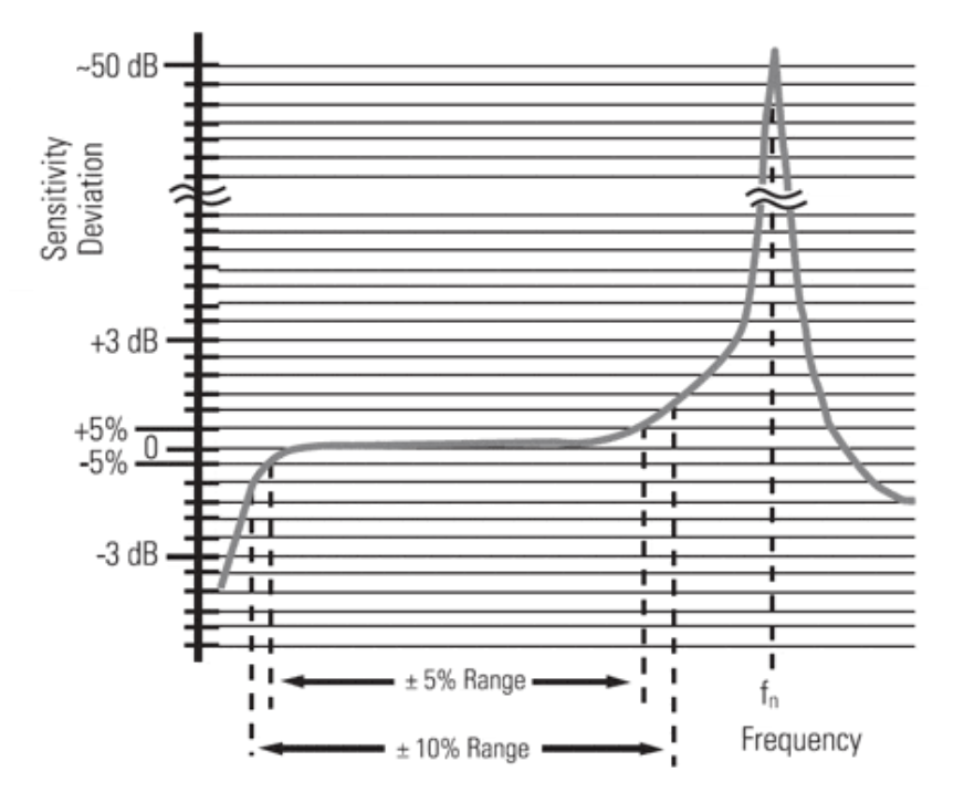 通常傳感器靈敏度偏差低于5%范圍內(nèi)使用是可以接受的。而此時(shí)的高頻測(cè)量上限一般在接近傳感器固有頻率的20%左右。高頻響應(yīng)可能受激勵(lì)電流、電纜長(zhǎng)度和電纜電容的限制。