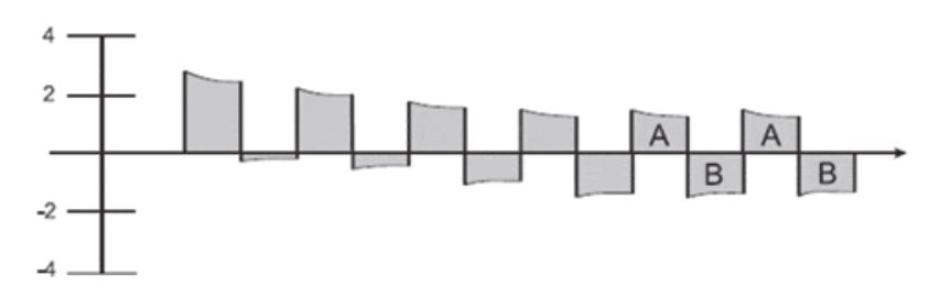 在這個(gè)例子中,在一個(gè)穩(wěn)態(tài)脈寬和脈沖間隔為一秒的AC耦合壓力應(yīng)用,產(chǎn)生0-2V電壓輸出信號(hào)。其頻率保持不變但信號(hào)迅速衰減,直到信號(hào)在原始基線上下面積區(qū)域A=區(qū)域B,而且峰值相同。